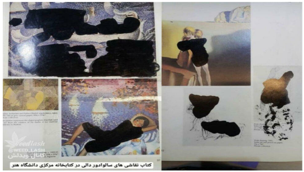 En avril 2021, plusieurs publications sont partagées sur Twitter venant tout droit de l’Université de Téhéran. Ce sont des images tirées d’un livre d’Histoire de l’Art dans lesquelles des reproductions du peintre Salvador Dali ont été en partie recouvertes au marqueur noir. Le livre de Nazanine Hozar prend pieds dans un Iran du passé, et pourtant il ne paraît pas si lointain.