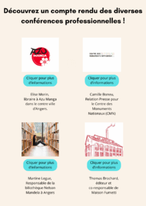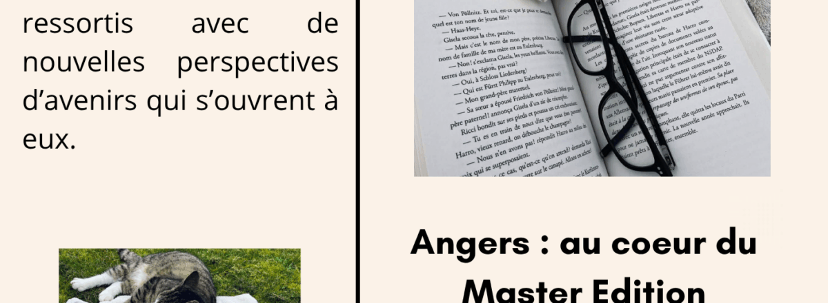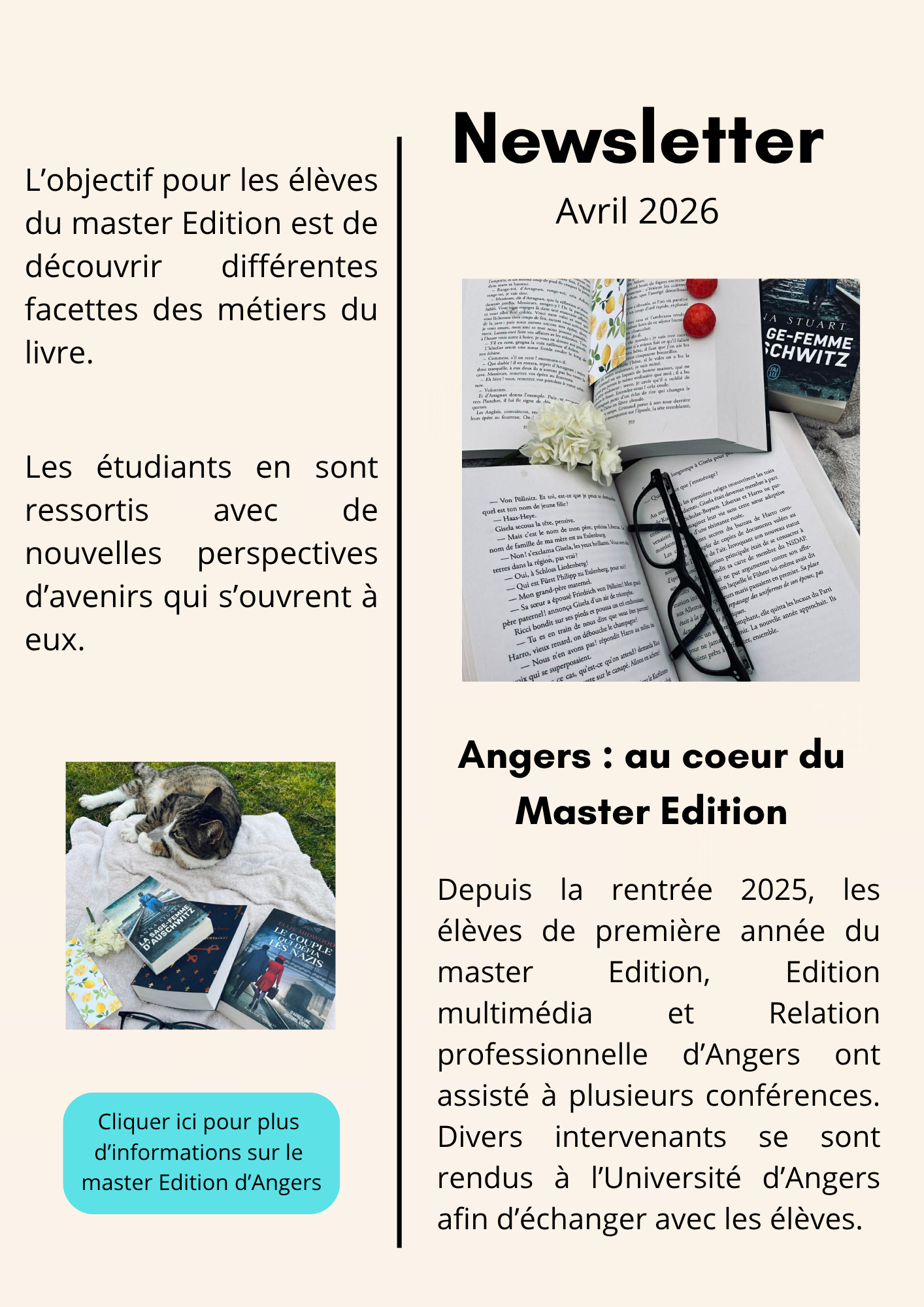 Vous pouvez trouver les informations du master sur le site de l’université d’Angers et le Descriptif M2 édition pro 2019-2020.
