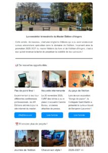Vous pouvez trouver les informations du master sur le site de l’université d’Angers et le Descriptif M2 édition pro 2019-2020.