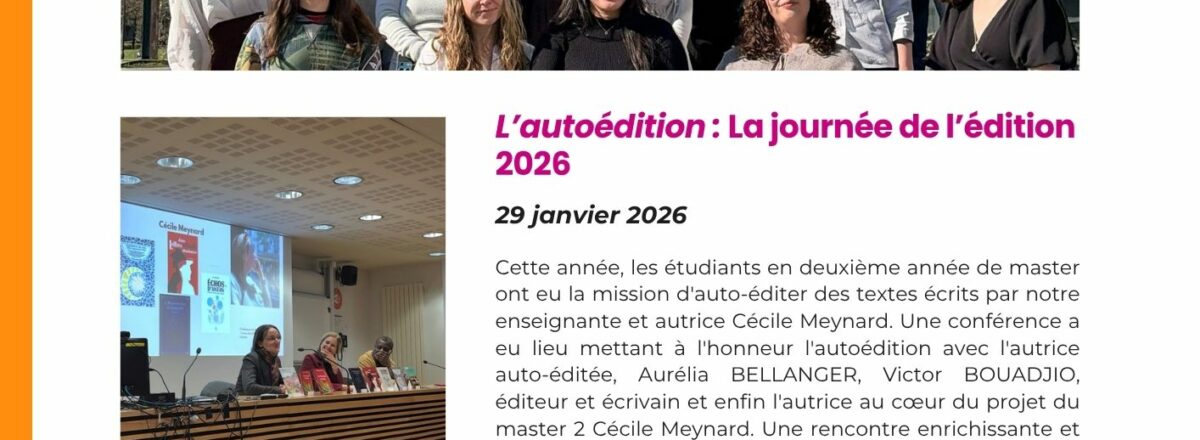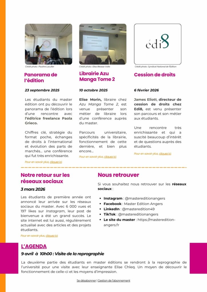 Cette Newsletter d’avril s’inscrit comme un bilan de l’année. Je souhaitais informer des événements qui avaient eu lieu dans le cadre de notre première année de formation (Conférences, journée de l’édition 2026, visite de la bibliothèque Saint-Éloi, de la reprographie de l’Université d’Angers et plus encore… ). Cette newsletter donne accès à des articles disponibles sur le site du master édition d’Angers grâce à des hyperliens comme c’est le cas pour la conférence sur la cession de droits.