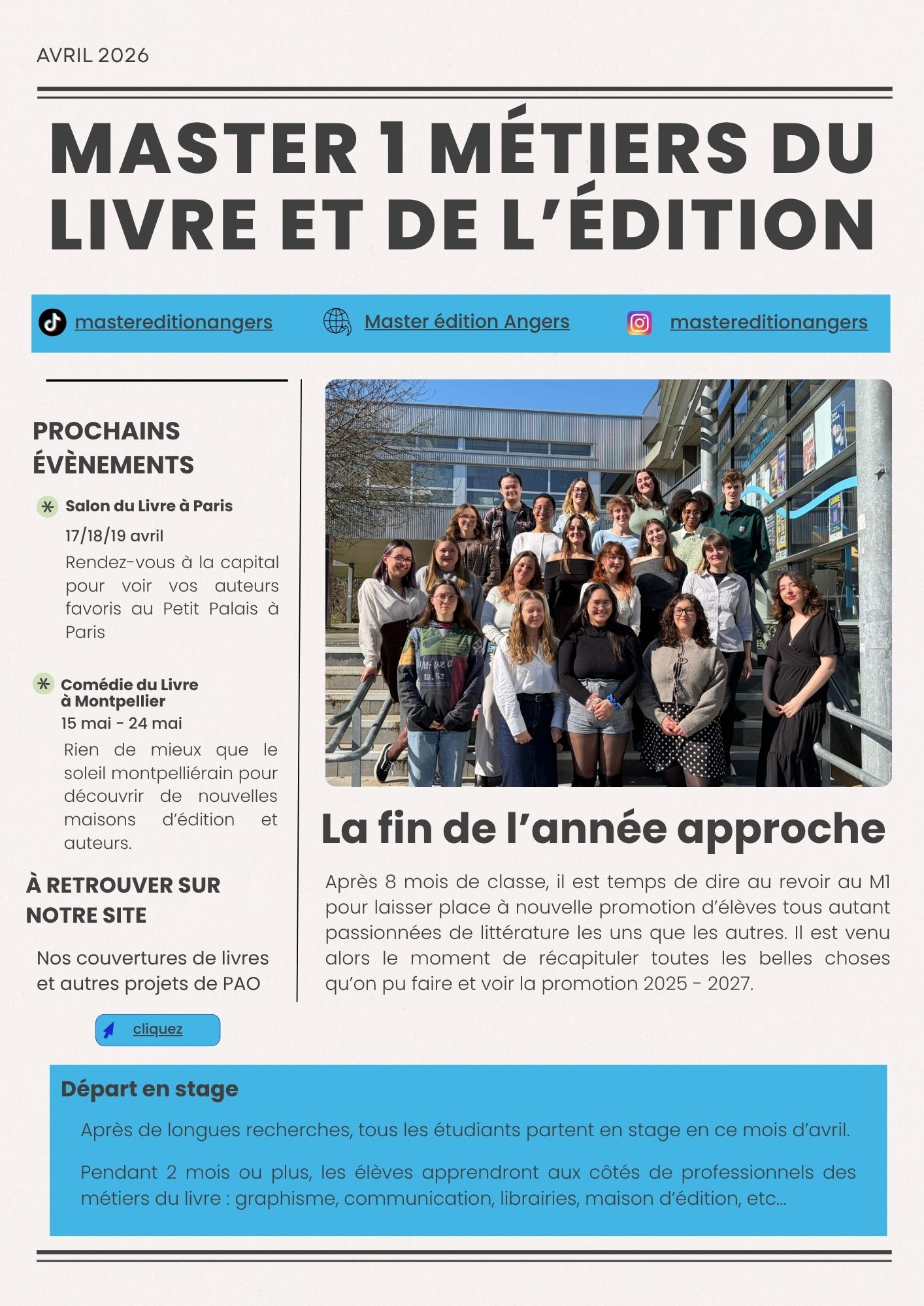 L’adresse de notre site Web est : https://masteredition-angers.fr, le site du Master Edition, Edition Multimedia et Rédaction Professionnelle de l'Université d'Angers.
