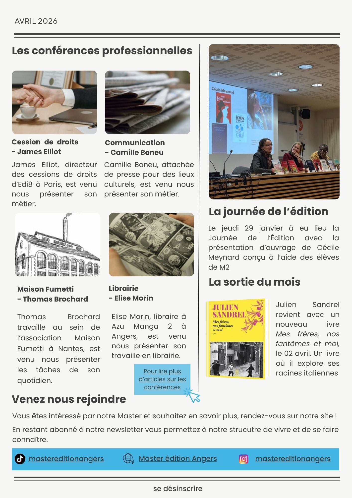 Vous pouvez trouver les informations du master sur le site de l’université d’Angers et le Descriptif M2 édition pro 2019-2020.