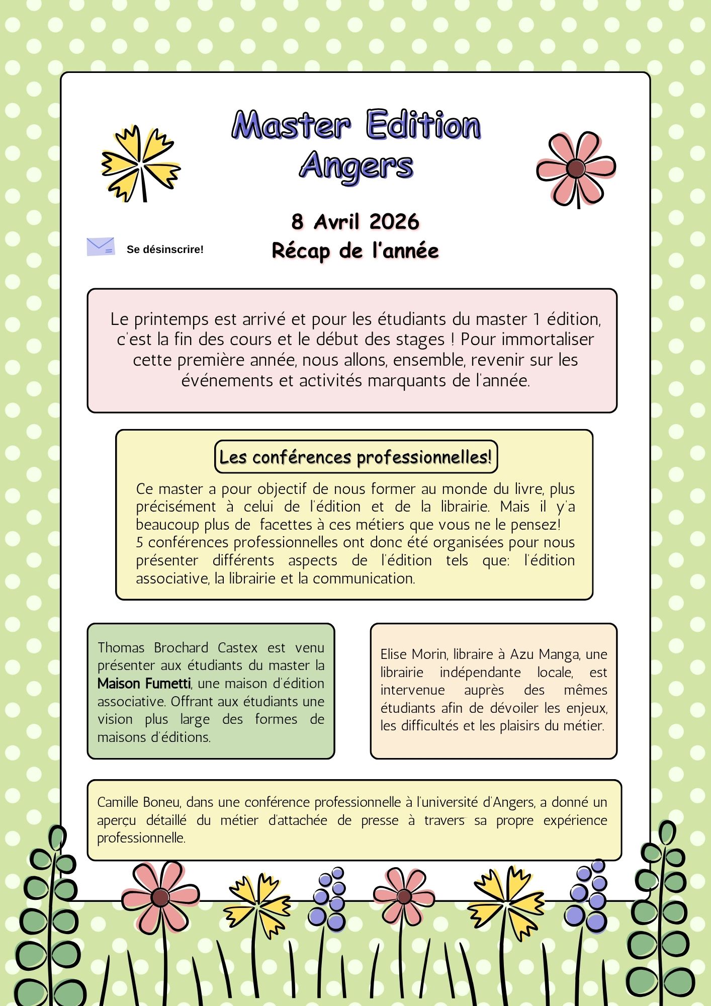 Vous pouvez trouver les informations du master sur le site de l’université d’Angers et le Descriptif M2 édition pro 2019-2020.